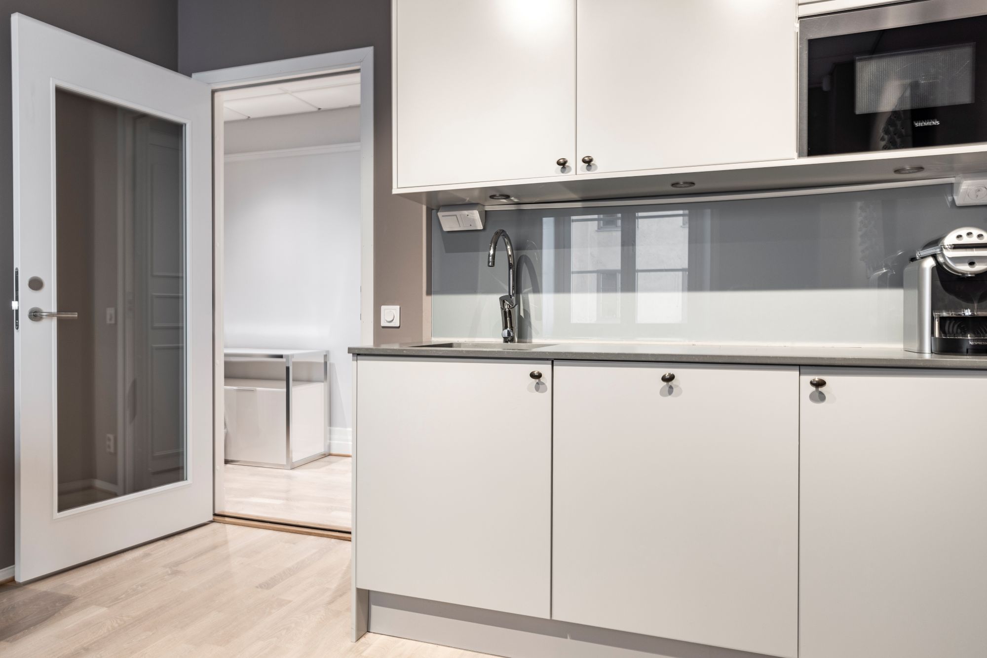 Planlösningen bygger på ett arbetsrum med pentry.