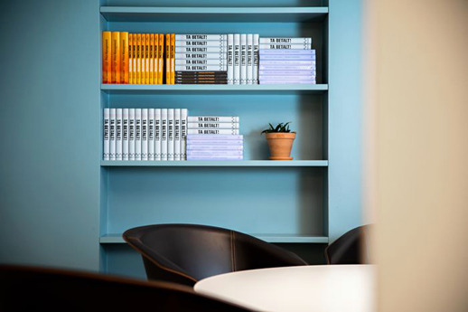 När DLL styrde riktningen mot Kungsgatan 36 i Stockholm var de eniga om att skapa en trivsam arbetsplats dit medarbetare, kunder och partners vill komma för att mötas. I entrén möts besökaren av en ljus lokal i varm färgskala, tre soffgrupper och en kaffeavdelning med magasin att bläddra i.