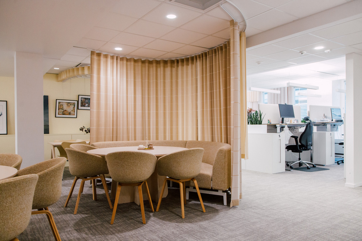 Flexibilitet har varit ett ledord för finansbolaget DLL i utformningen av sina nya lokaler. Ett modernt kontor kräver innovativa kontorslösningar för framtiden. DLL har ett smart bokningssystem med en app där medarbetarna kan boka kontorsplatser. Det har lett till att antalet fasta arbetsplatser har minskat och skapat utrymme för trivsamma miljöer där medarbetarna kan mötas.