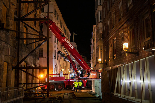 Under natten till söndagen den 3 november anlände en 18 meter lång mobilkran till korsningen i Bibliotekstan mitt i Stockholm. Mobilkranen hade som uppgift att lyfta en andra, större byggkran över den gamla 1800-talsfasaden och placera den på innergården.