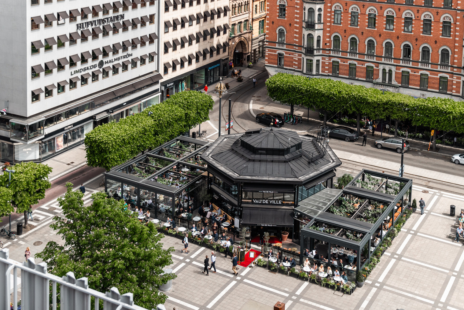 Mitt på torget står Palmhuset. Men istället för att vara fyllt av palmer, fyller fastigheten Norrmalm 2:63 sin funktion som restaurang och bar. Efter en genomgripande renovering 2012 lockar nu Vau De Ville de förbipasserande stockholmarna med franskt mathantverk och en generös uteservering.